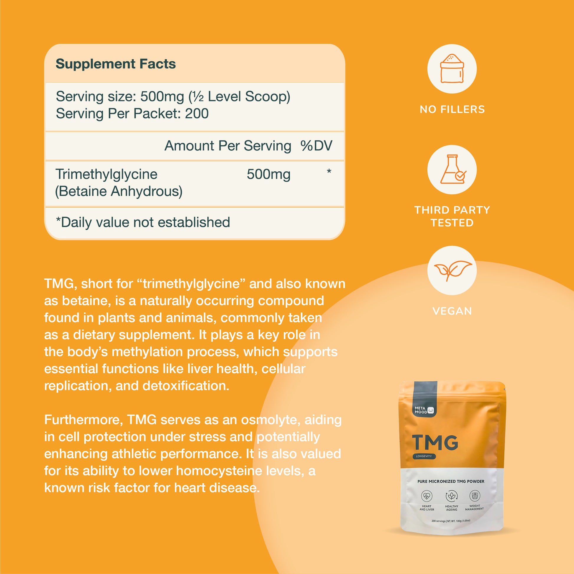 TMG, or Trimethylglycine, is a naturally occurring compound derived from foods like beets, spinach, and grains. It acts as a methyl donor, supporting processes such as detoxification, DNA repair, and cardiovascular health.